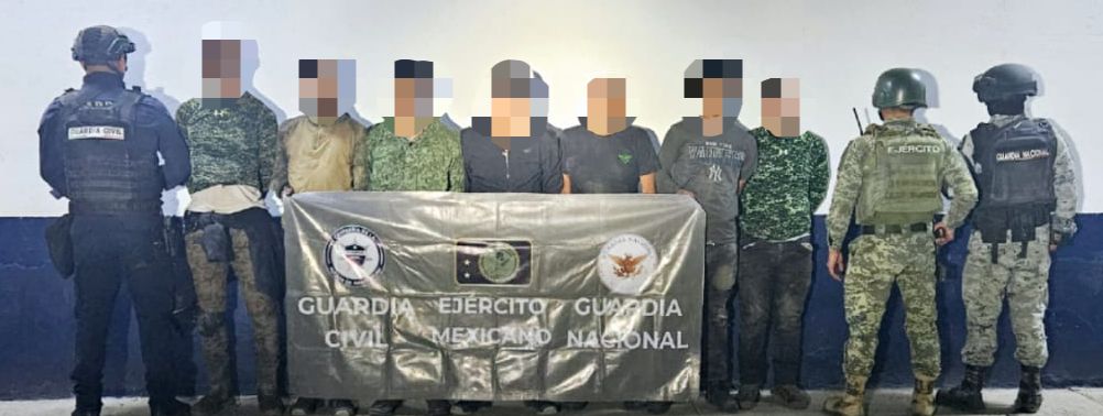Apatzingán, Michoacán, 6 de enero de 2025.- Elementos de las secretarías de Seguridad Pública (SSP) y de la Defensa Nacional (Defensa), así como de la Guardia Nacional (GN) detuvieron a siete presuntos integrantes de una célula delictiva a quienes les decomisaron siete fusiles.