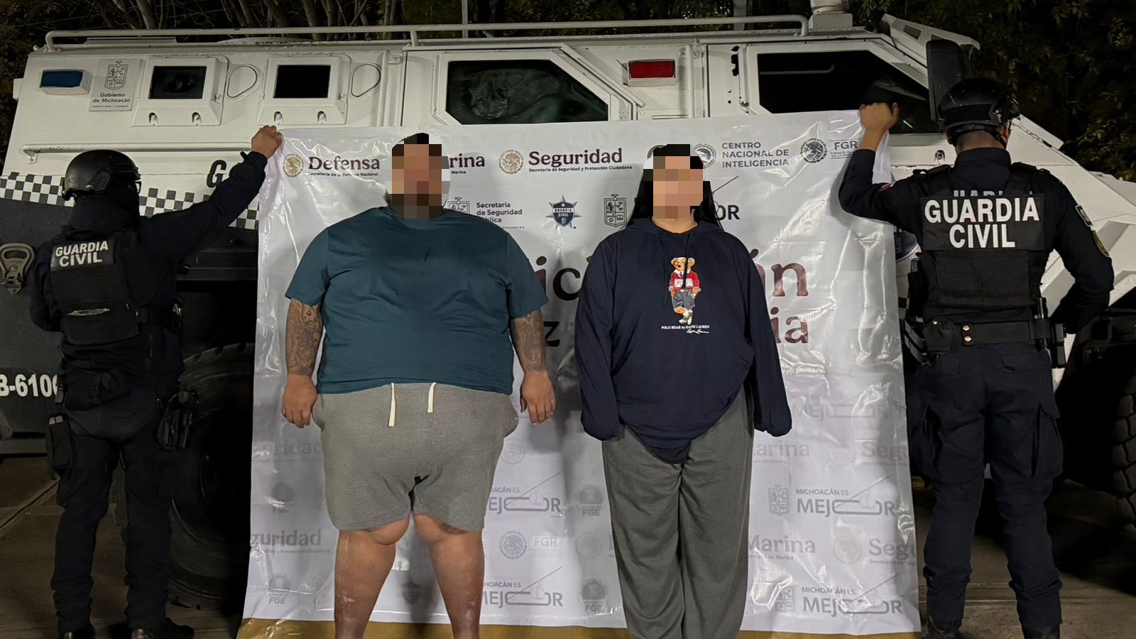 La acción operativa derivó de trabajos de investigación e inteligencia que permitieron dar acompañamiento operativo a una orden de cateo en un inmueble ubicado en la colonia Centro de Apatzingán, donde fue asegurado el objetivo, junto con una mujer identificada como Kimberly “N”.