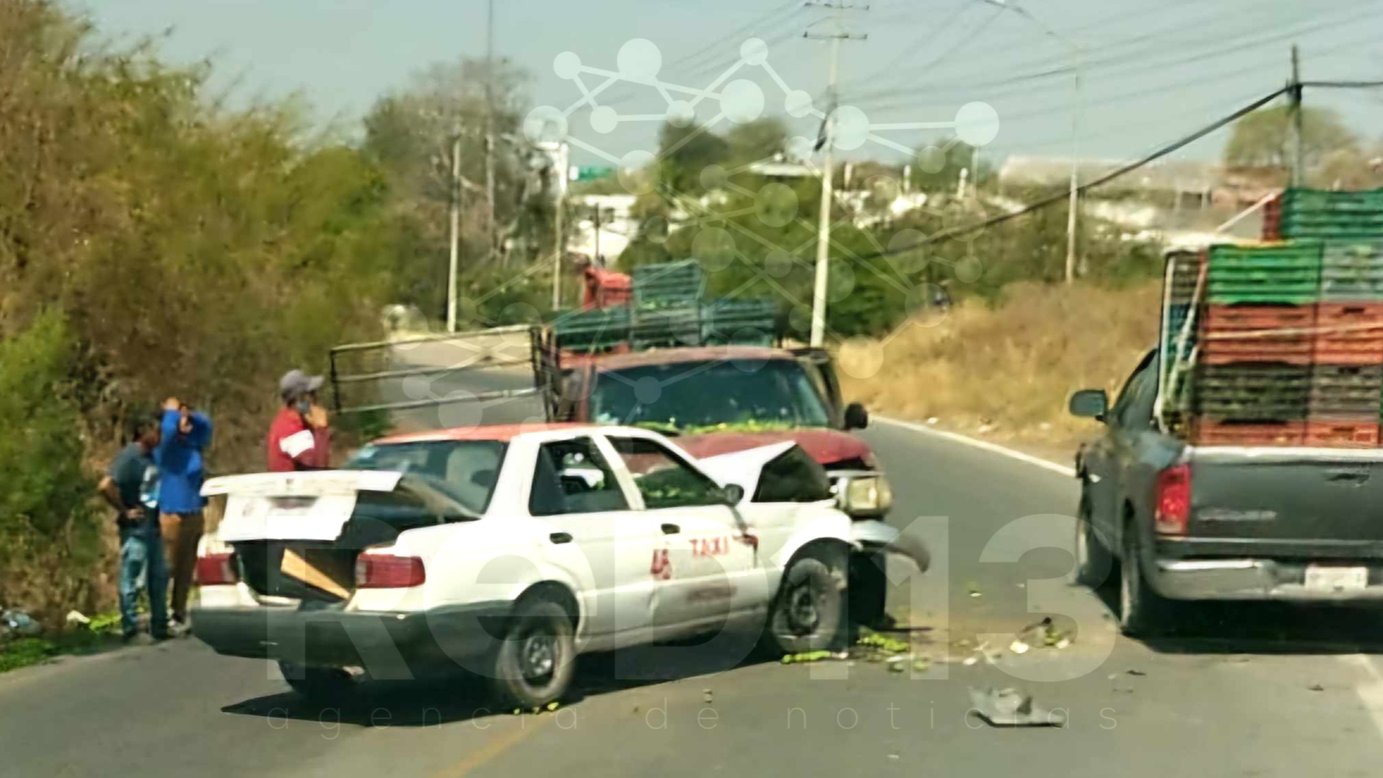 Apatzingán, Michoacán, 13 de marzo de 2025.- Una camioneta cargada con limón y un taxi protagonizaron un aparatoso choque de frente, que dejó al menos tres personas levemente heridas y cuantiosos daños materiales, en esta demarcación de Apatzingán.