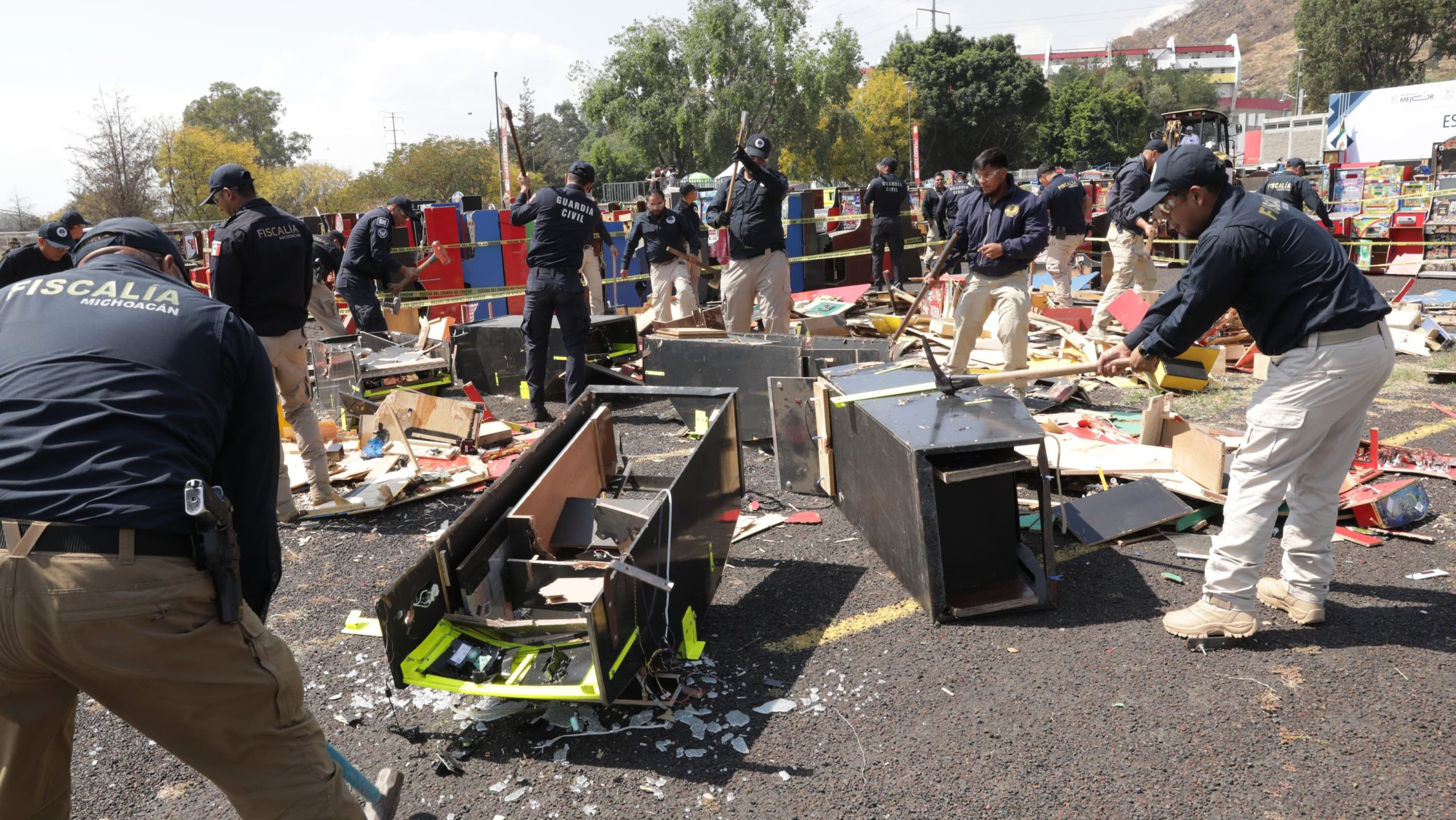 Morelia, Michoacán, 10 de febrero de 2025.- El gobernador Alfredo Ramírez Bedolla dio arranque a la destrucción masiva de maquinitas tragamonedas decomisadas en tiendas y minicasinos de Morelia, Uruapan, Zitácuaro, Zamora, Lázaro Cárdenas, Apatzingán y Maravatío.