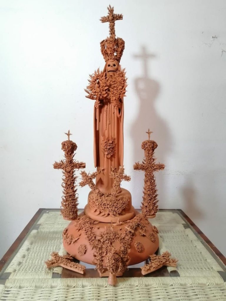 Su pieza, una “Monja coronada”, la realizó a lo largo de dos meses, en barro natural y lleva 13 cruces, ademas de pastillaje a mano y la pieza mide un metro con 30 centímetros.