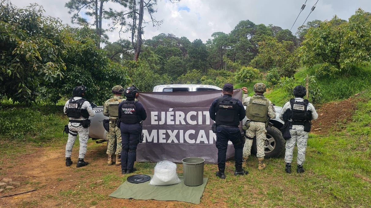 Uruapan, Michoacán, 26 de septiembre de 2025.- Este lunes elementos de las secretarías de Seguridad Pública (SSP) y de la Defensa Nacional (Defensa) encontraron al interior de un vehículo, presuntamente abandonado en una zona serrana de Uruapan, 15 kilogramos de metanfetamina.