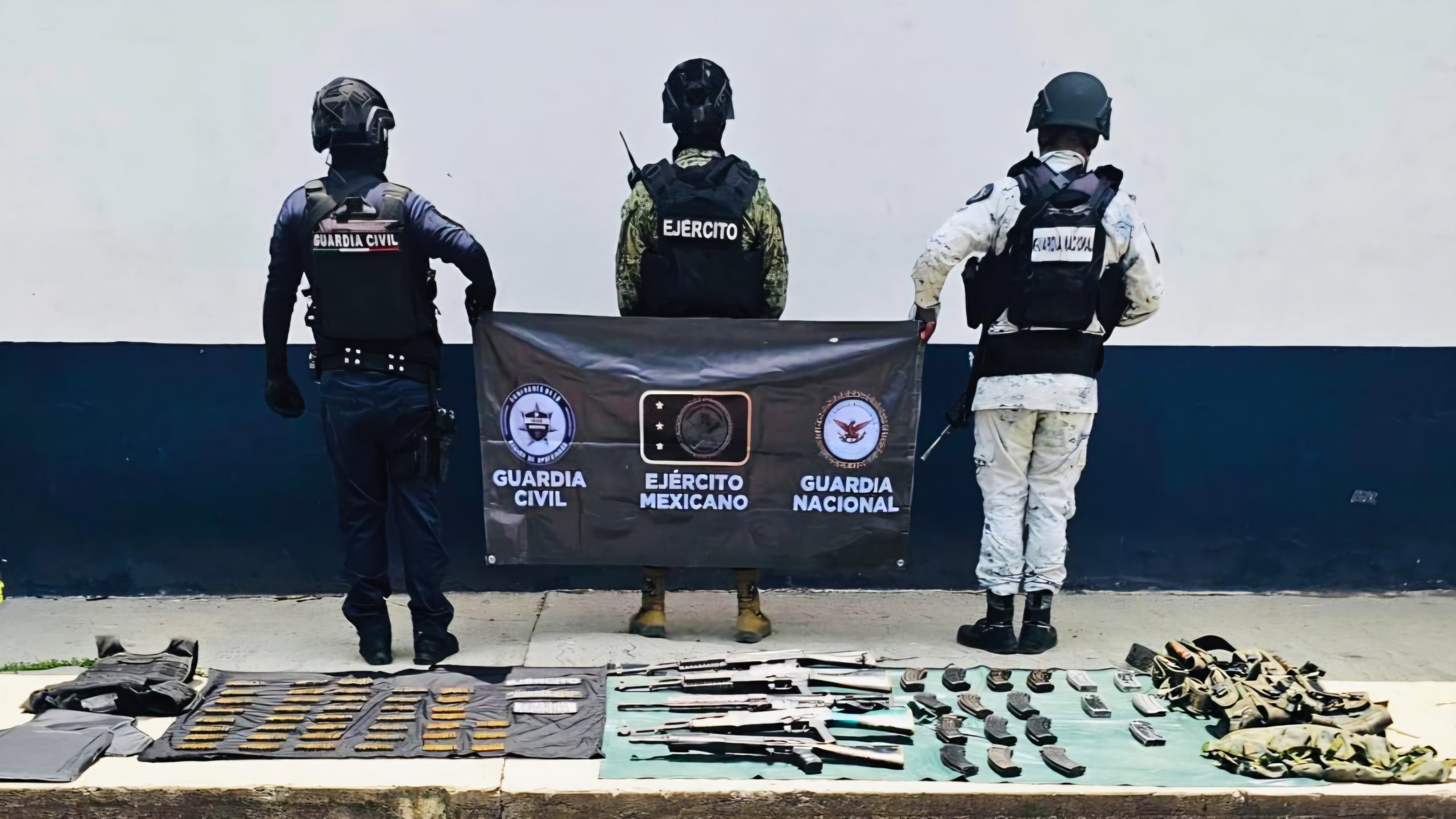 En la localidad de La Ruana de esta demarcación, los efectivos de la Guardia Civil, el Ejército Mexicano y la Guardia Nacional decomisaron cuatro armas de fuego calibre 7.62X39 milímetros y una calibre .223 milímetros, así como 410 cartuchos útiles y 18 cargadores, además de equipo táctico.