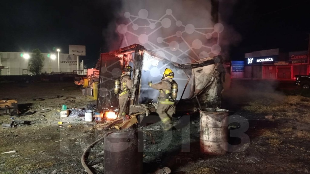 Morelia, Michoacán, 22 de marzo de 2026.- Elementos de Bomberos Morelia combatieron el incendio de dos cajas secas de camioneta que eran utilizadas como refugio por un guardia de seguridad en un predio donde se resguarda maquinaria, el cual se ubica frente a la colonia Los Ángeles, en la zona norte de la ciudad, informaron autoridades policiales y de rescate.