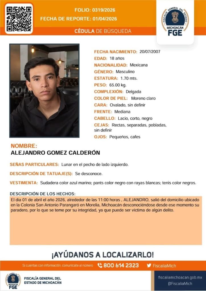 Morelia, Michoacán, 03 de abril de 2026.-Alejandro Gómez Calderón, de 18 años, fue reportado como desaparecido el 1 de abril de 2026 en la colonia San Antonio Parangaré, ubicada en el municipio de Morelia.