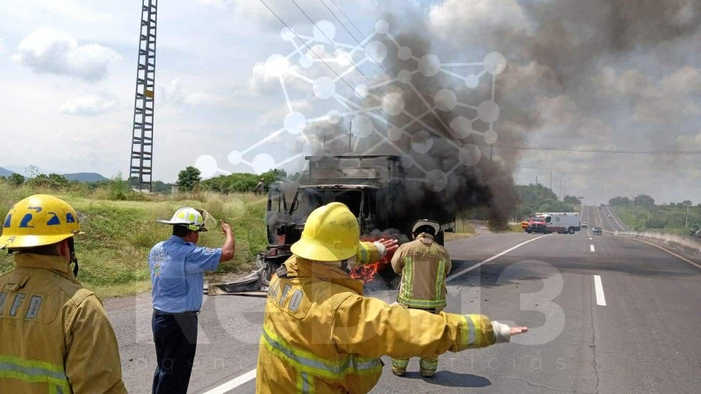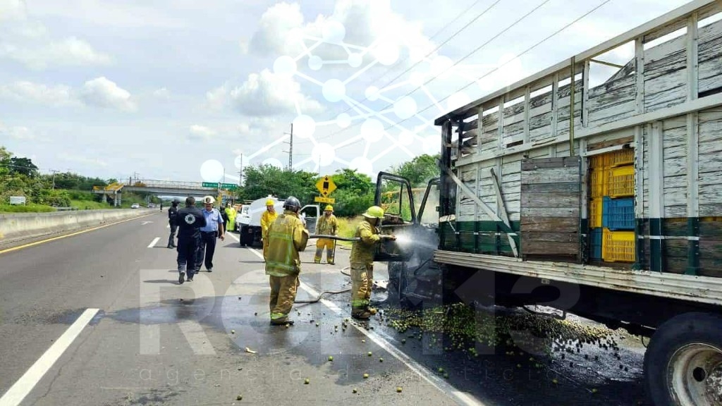 Efraín S., tripulaba un camión tipo Torton de color blanco con verde y placas de circulación NG-1201-C, cargado con limones, cuando a la altura del negocio «Quesos el Rojo», observó que del área del motor salía hubo y fuego, por lo que se orilló y se puso a salvo.