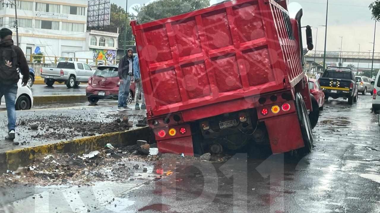 Según reportes preliminares, la unidad de carga, de color rojo, se desplazaba en dirección al Estadio Morelos cuando el conductor, al intentar cruzar la zona afectada, fue sorprendido por el hundimiento repentino del asfalto.