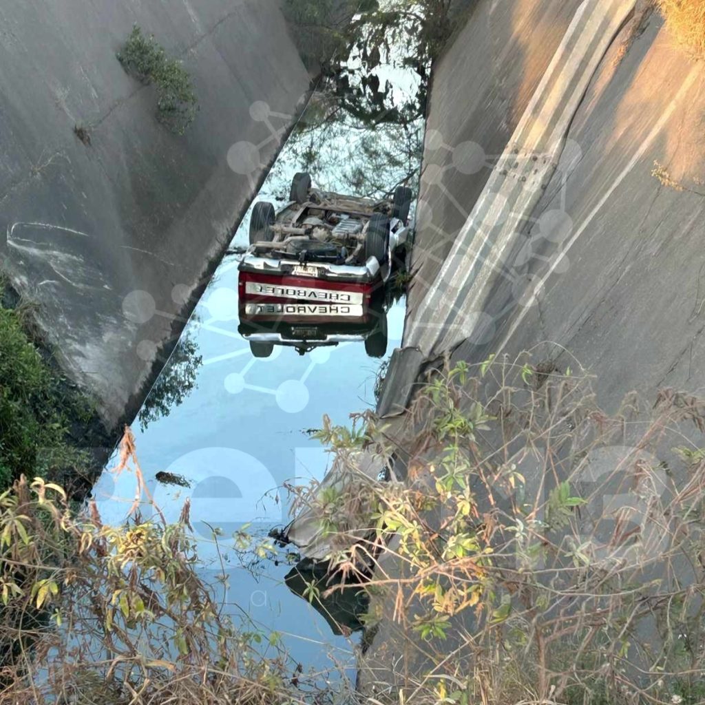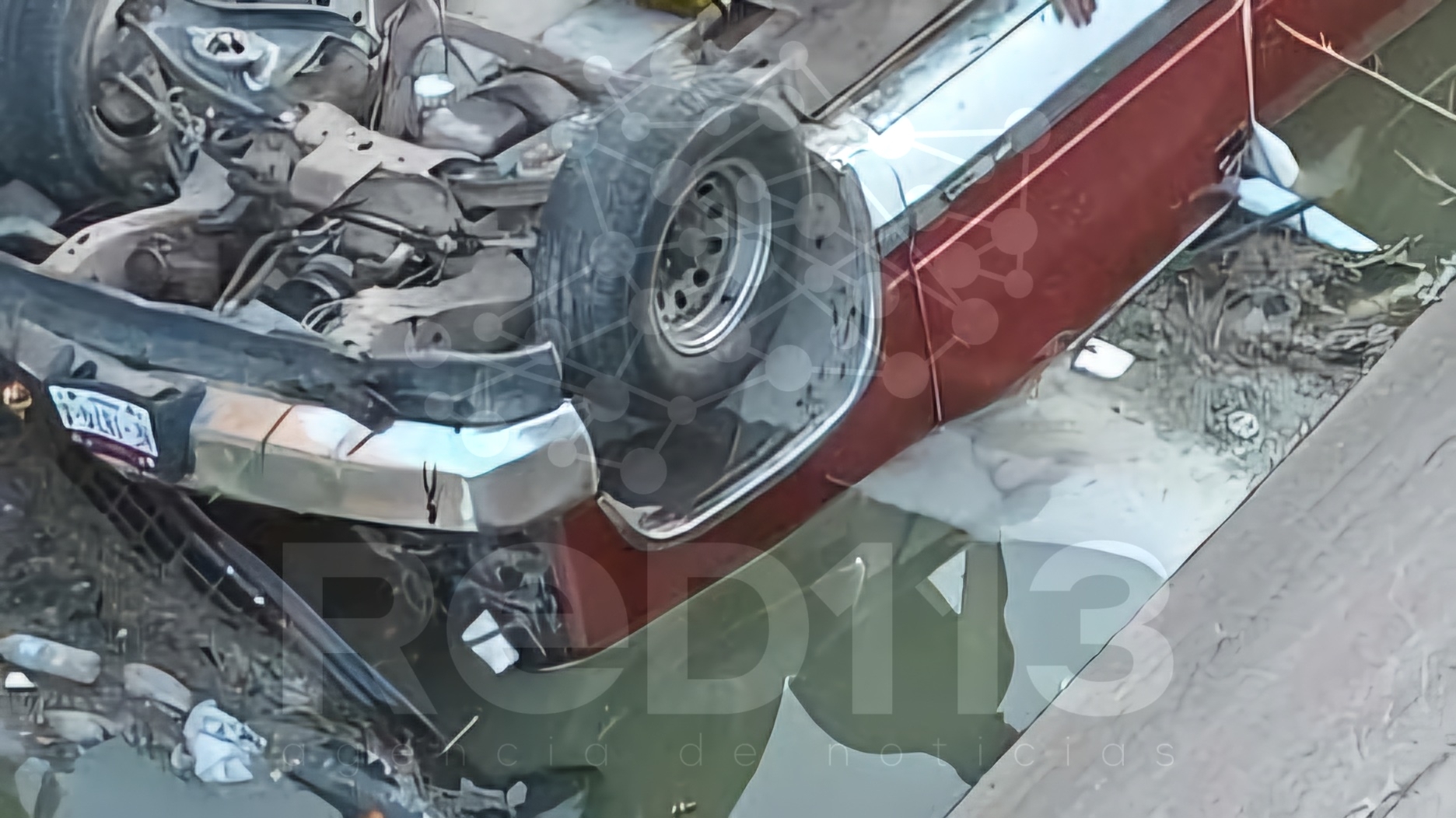 Los hechos ocurrieron este domingo, sobre la calle de Las Islas, cuando una furgoneta tipo Pickup de color guinda con blanco y placas NF1874-A, al pasar una tienda Oxxo se salió de control y volcó hacia el interior del citado afluente.