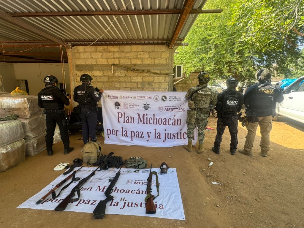 En este último punto fueron aseguradas además ocho armas de fuego tipo fusil, un arma corta, 28 cargadores metálicos para armas de uso reservado de las Fuerzas Armadas, 280 cartuchos útiles, equipo táctico, fornituras y chalecos con las siglas de un grupo delictivo.