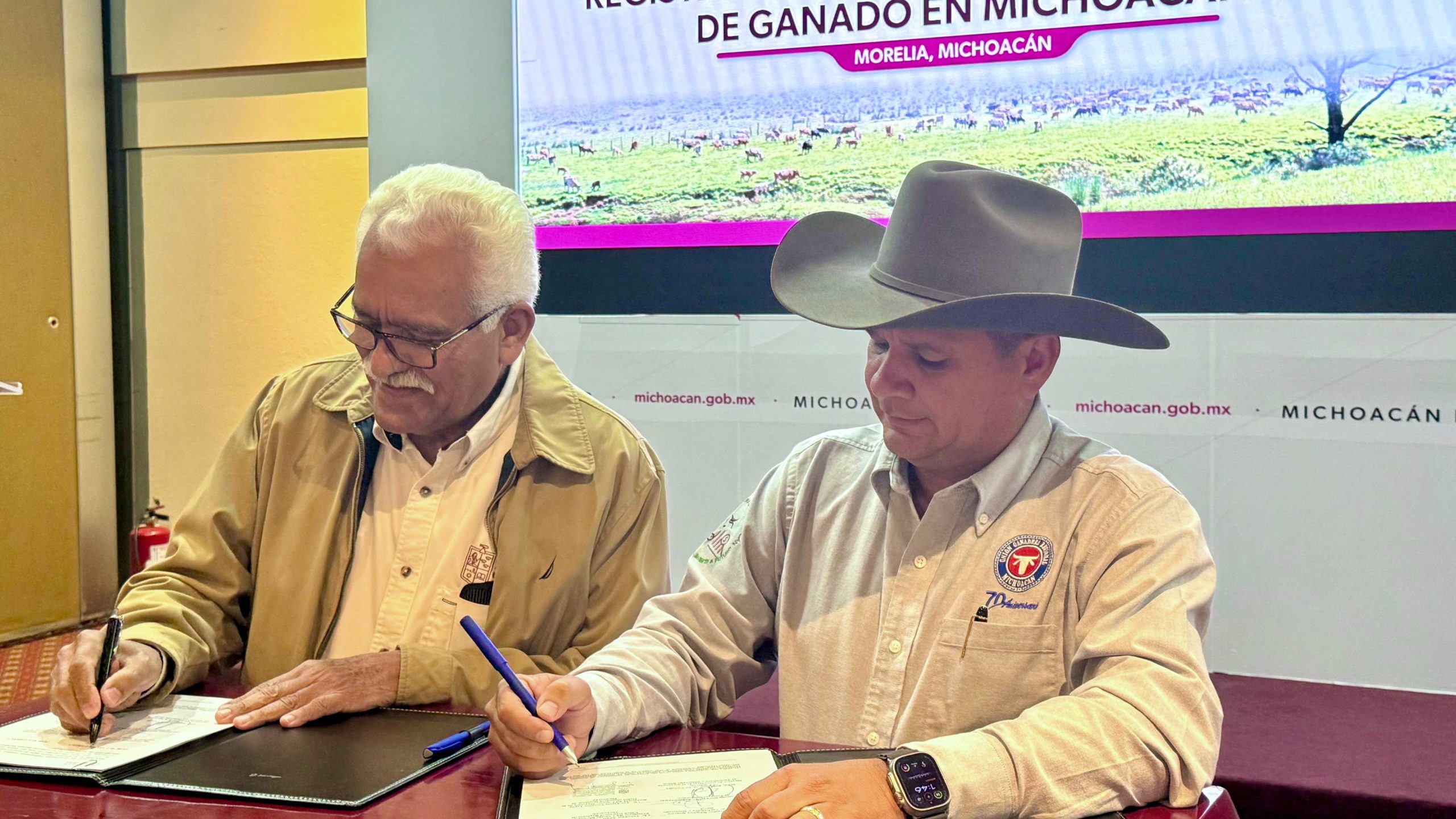 Morelia, Michoacán, 14 de agosto de 2025.- El Gobierno de Michoacán a través de la Secretaría de Agricultura y Desarrollo Rural (Sader) y la Unión Ganadera Regional de Michoacán (UGRM), mediante firma de convenio de coordinación se suman al Registro Electrónico de Movilización pecuaria en Michoacán (REEMO).