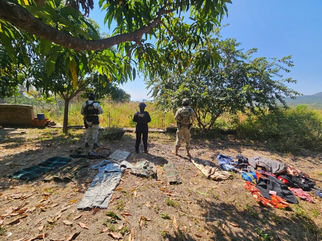 Buenavista, Michoacán, 8 de noviembre de 2025.- Elementos de las secretarías de Seguridad Pública (SSP) y de la Defensa Nacional (Defensa), localizaron e incineraron cuatro campamentos clandestinos presuntamente utilizados por grupos delictivos en el municipio de Buenavista.
