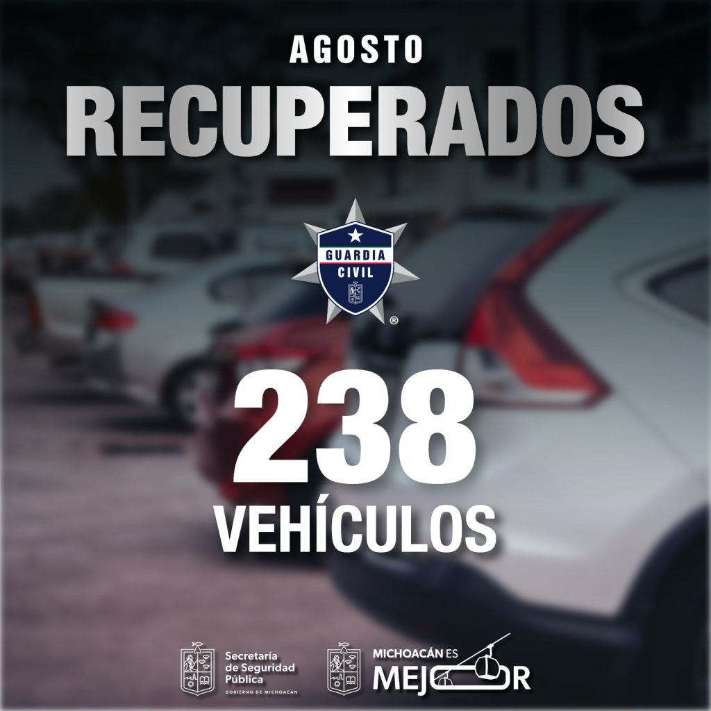 Morelia, Michoacán, 7 de septiembre del 2025.- Un total de 238 vehículos fueron recuperados durante el mes de agosto, a través de los sistemas operativos y el reforzamiento a las acciones de vigilancia de los elementos de la Secretaría de Seguridad Pública (SSP), informó su titular Juan Carlos Oseguera Cortés.
