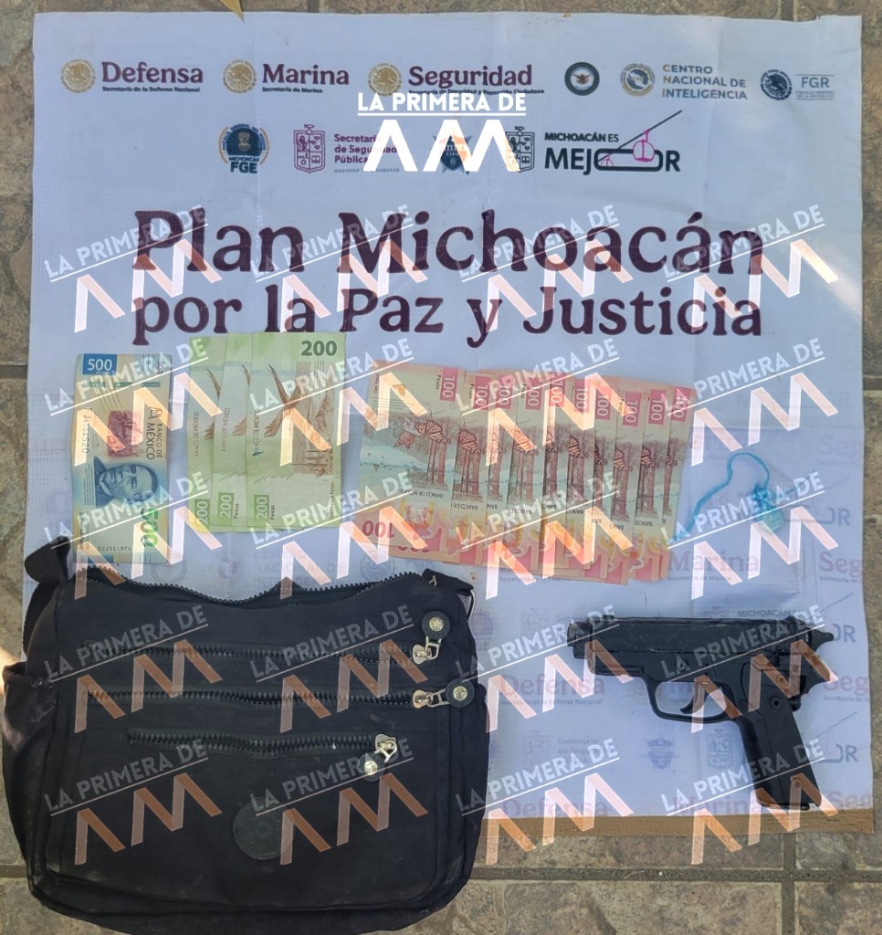 Apatzingán, Michoacán, 13 de febrero de 2026.- Producto de las labores del Plan Paricutín en el municipio de Apatzingán, agentes de las secretarías de Seguridad Pública (SSP) y de la Defensa Nacional (Defensa) detuvieron a dos presuntos asaltantes de una tienda de conveniencia en posesión de una réplica de arma de fuego, droga, dinero en efectivo y un vehículo robado.