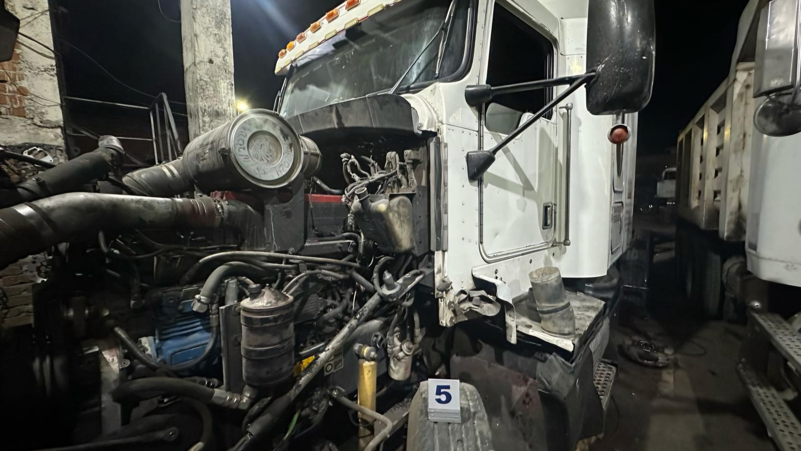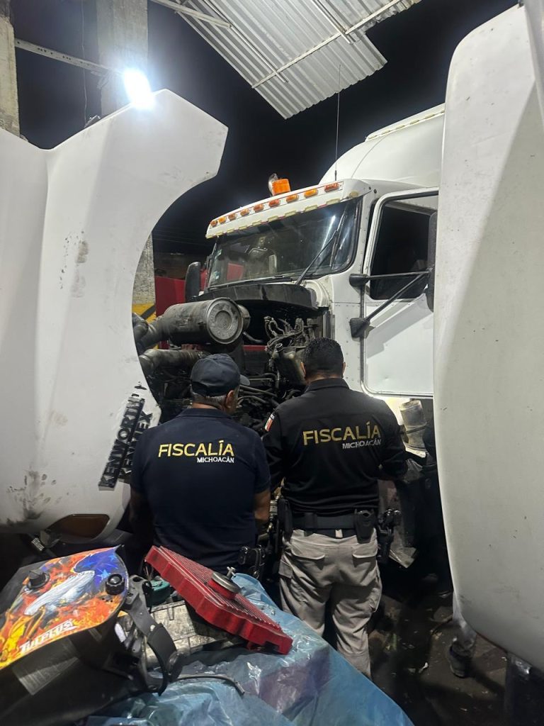 Morelia, Michoacán, a 21 de marzo de 2025.- En cumplimiento a una orden de cateo ejecutada en un taller mecánico ubicado en el fraccionamiento Los Ángeles, en el municipio de Morelia, la Fiscalía General del Estado de Michoacán (FGE), aseguró dos camiones tipo tortón, un tracto camión, un motor y un chasis, todos ellos con reporte de robo y alteraciones en sus medios de identificación.
