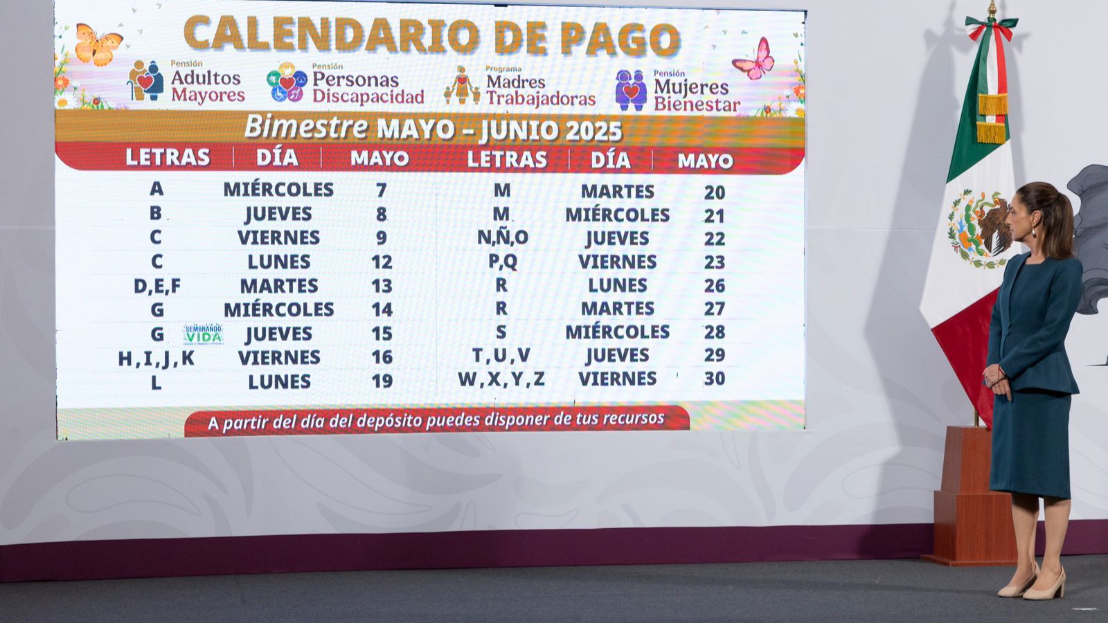 Agregó que del 20 al 30 de mayo, se llevará a cabo la dispersión de las Pensiones y Programas para el Bienestar para las personas cuyo primer apellido inicie con las letras M a la Z.