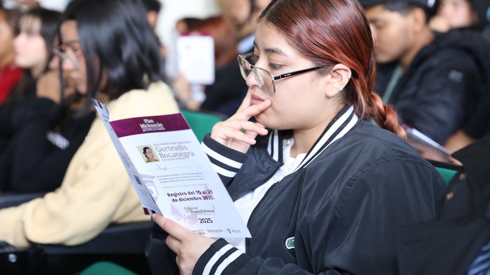 En asamblea informativa realizada en la Universidad Tecnológica de Morelia (UTM), el mandatario destacó que se trata de un apoyo universal, por lo que ningún estudiante se quedará sin recibir los mil 900 pesos que, de manera bimestral, se depositarán a partir de febrero de 2026 para cubrir los gastos de transporte público.