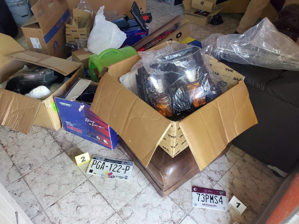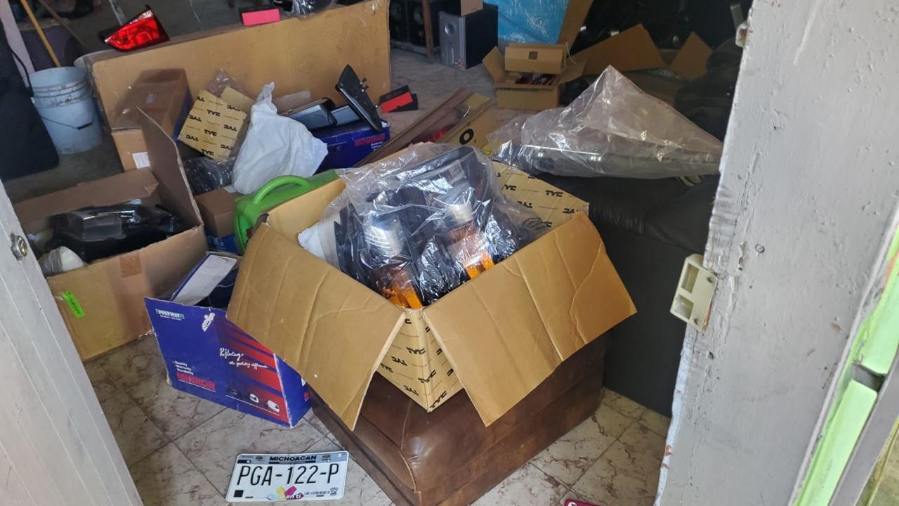 En el lugar fueron localizadas diversas autopartes nuevas, así como juegos de placas de circulación de distintas entidades, entre ellas Michoacán, Texas y Ciudad de México. Asimismo, se aseguró una placa de con reporte de robo ocurrido en 2018 y que estaba relacionada con un vehículo que ya había sido recuperado con anterioridad.