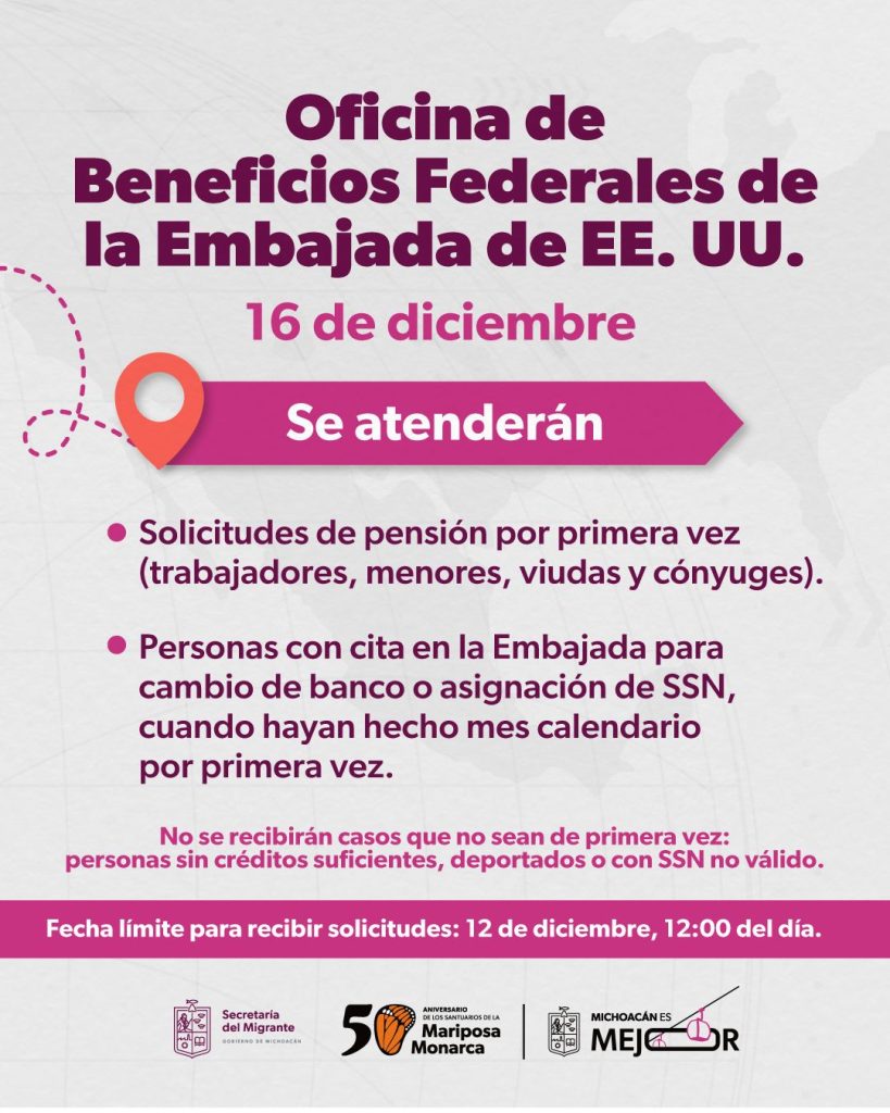 Morelia, Michoacán, 27 de noviembre de 2025.- La Secretaría del Migrante (Semigrante) informa que el próximo 16 de diciembre se contará con la visita del personal de la Oficina de Beneficios Federales (FBU) de la Embajada de los Estados Unidos en México, con el propósito de fortalecer la atención a las y los michoacanos que buscan acceder a una pensión del Seguro Social estadounidense.