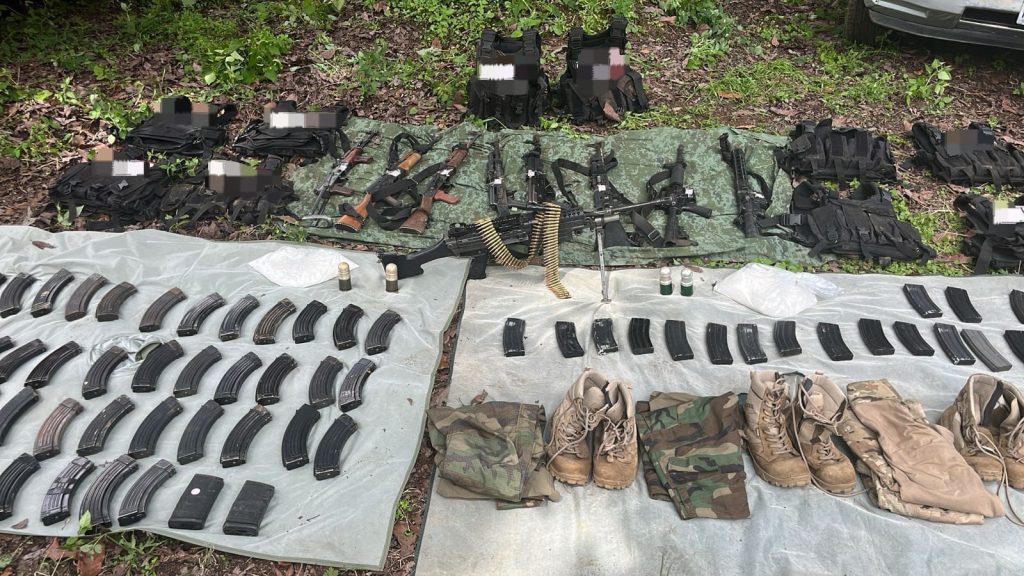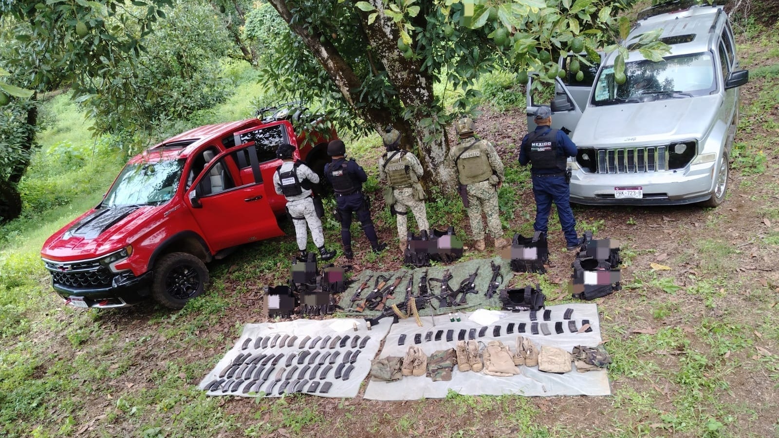 Uruapan, Michoacán, 3 de octubre de 2025.- Elementos de las secretarías de Seguridad Pública (SSP) y de la Defensa Nacional (Defensa) aseguraron una ametralladora, ocho fusiles, cuatro granadas de aditamento, droga y vehículos como resultado de las tareas del operativo Blindaje Uruapan.