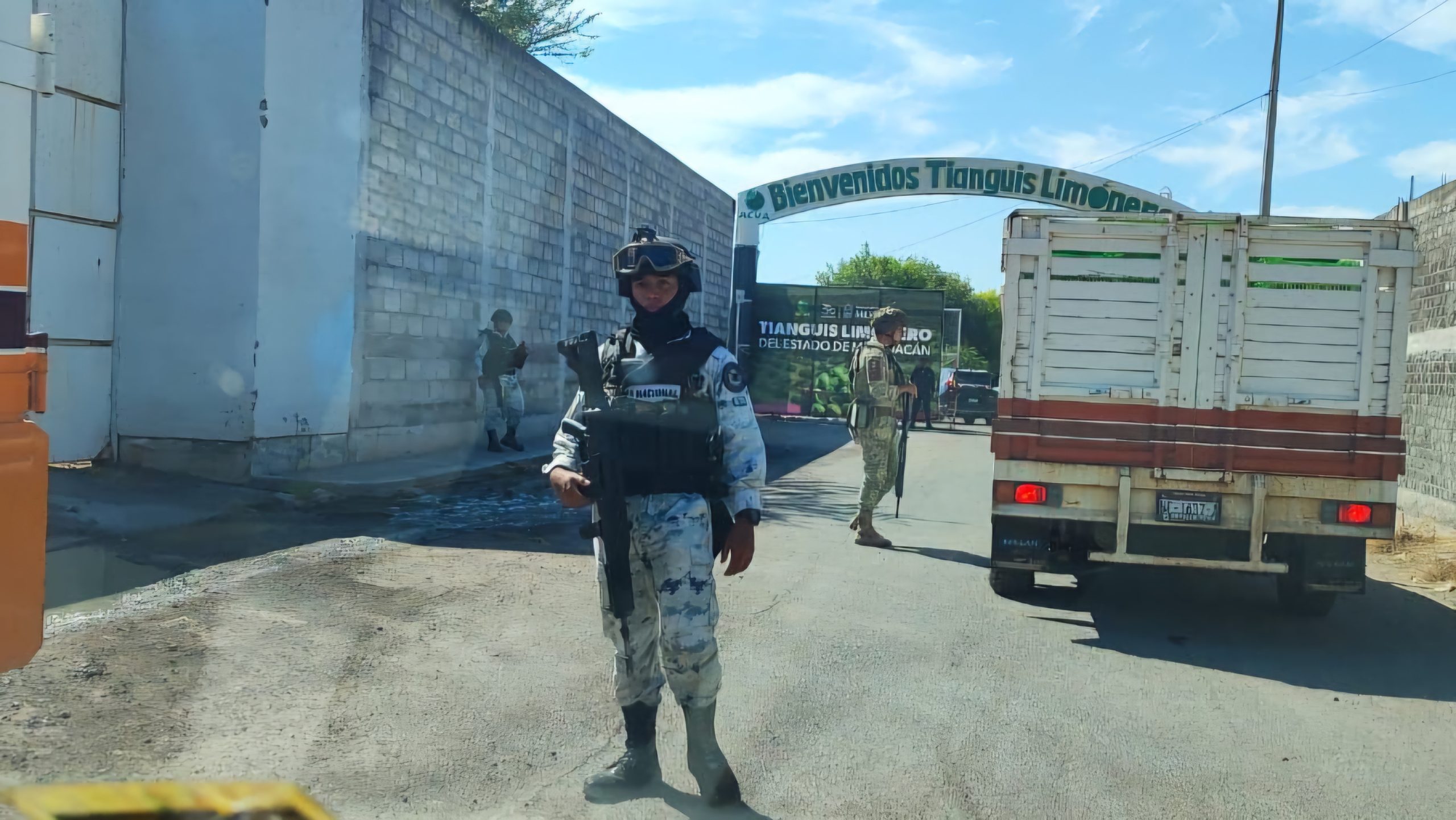 Apatzingán, Michoacán, 24 de febrero del 2025.- Elementos de las secretarías de Seguridad Pública (SSP), y de la Defensa Nacional (Defensa), realizan diversos operativos en el Tianguis Limonero y en sus inmediaciones para garantizar el orden público en los procesos productivos del sector citrícola.