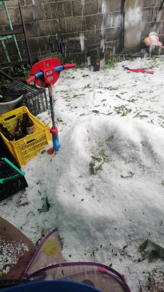 La tormenta inició por la tarde, acompañada de lluvia intensa y ráfagas de viento. En cuestión de minutos, el granizo comenzó a acumularse, formando capas de varios centímetros que tapizaron el suelo, tejados y estructuras ligeras.