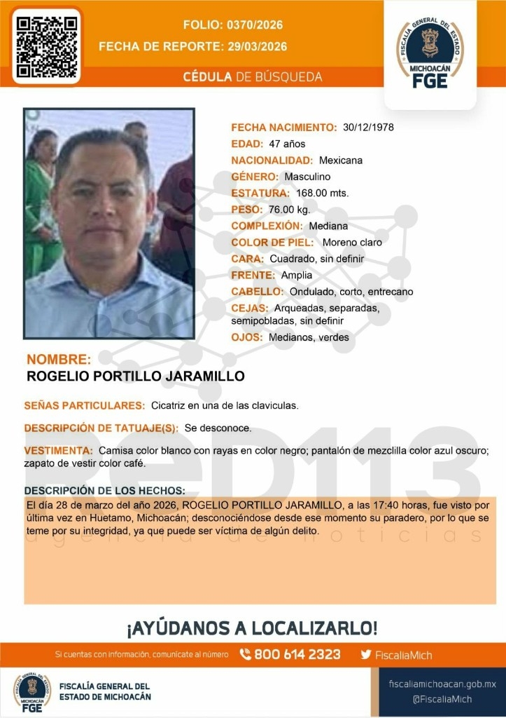 La desaparición del mencionado hombre fue reportada ante las instancias competentes el día 29 de marzo, por lo que se emitió una ficha de búsqueda con su media filiación.