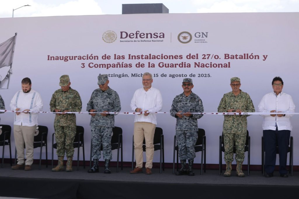 Apatzingán, Michoacán, 15 de agosto de 2025.- El gobernador Alfredo Ramírez Bedolla inauguró en Apatzingán las instalaciones del 27 Batallón y tres compañías de la Guardia Nacional, que contribuirán a fortalecer el esquema de seguridad en este municipio y la zona de Tierra Caliente.