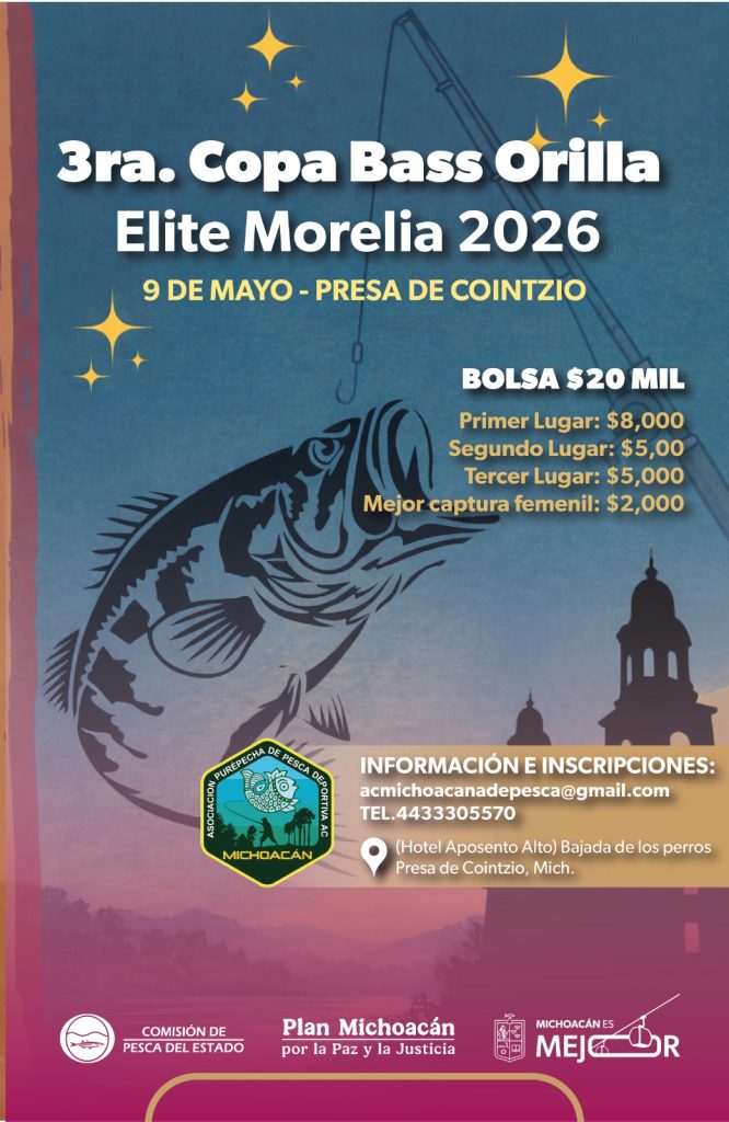 Morelia, Michoacán, 21 de abril de 2026.- La Comisión de Pesca de Michoacán (Compesca), en conjunto con la Asociación Purépecha de Pesca Deportiva A.C., invita a la Tercera Copa Bass Elite Morelia, que se llevará a cabo en la presa de Cointzio el próximo 9 de mayo. Este certamen, en la modalidad de orilla, busca impulsar la actividad pesquera y recreativa en la entidad mediante competencias de alto nivel.