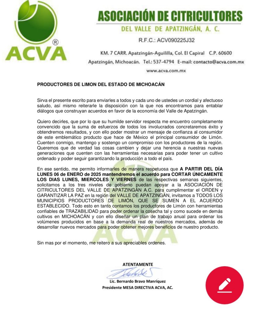 Apatzingán, Michoacán, 05 de enero de 2025.- La Asociación de Citricultores del Valle de Apatzingán (ACVA), anunció este domingo que reanudarán el corte de limón en huertas de Apatzingán a partir de este lunes de de enero.