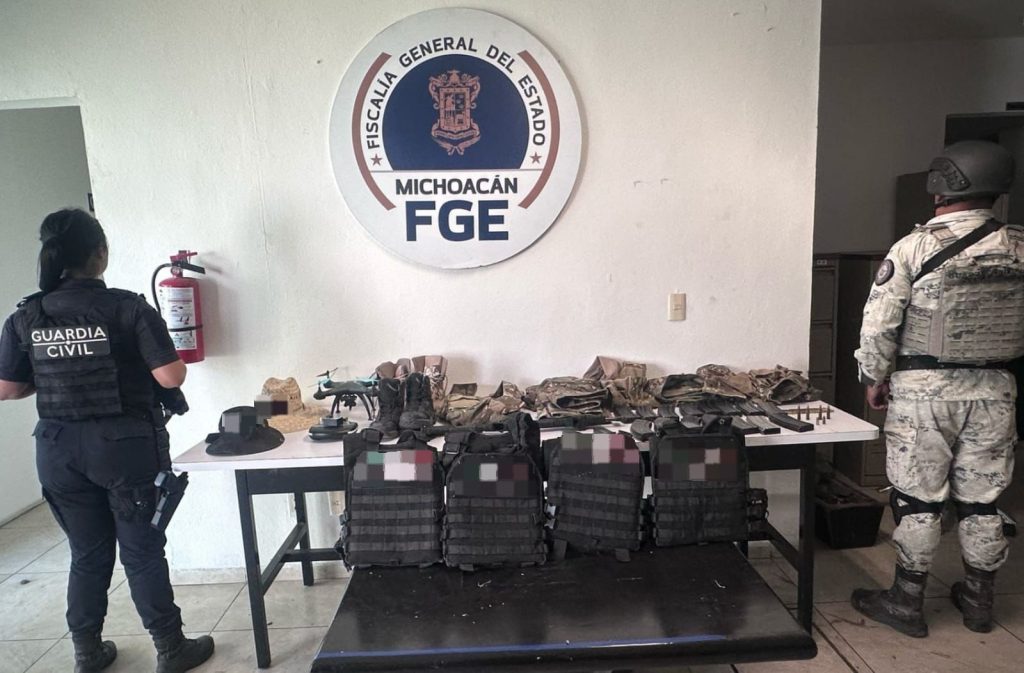 Al continuar con las tareas operativas en la zona, los uniformados ubicaron un campamento ilícito cerca de una huerta de aguacates; en el sitio se encontró un fusil, también 17 cargadores, cuatro chalecos tácticos con leyenda alusiva a una célula delincuencial, tres uniformes de color camuflaje, dos pares de botas y un dron, así como una motocicleta de la marca Italika.