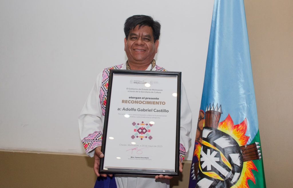 Morelia, Michoacán, 13 de junio de 2025.- El Gobierno de Michoacán, a través de la Secretaría de Cultura (Secum), entregó un reconocimiento y un estímulo económico de 15 mil pesos al maestro Adolfo Gabriel Castillo, pireri originario de la Isla de Urandén, municipio de Pátzcuaro, por su invaluable labor como creador, intérprete y promotor de la pirekua, canto tradicional p’urhépecha.