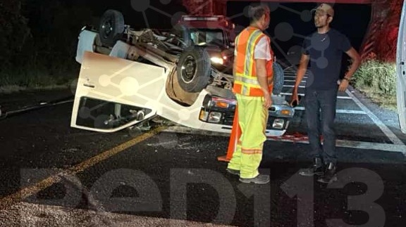 Los servicios de emergencia recibieron el reporte de un vehículo volcado que obstruía ambos carriles de la vía. Al llegar al sitio, los elementos de los Bomberos Voluntarios de Múgica localizaron una camioneta Nissan blanca, con placas NB-5902-D, recostada sobre el asfalto y con severos daños.