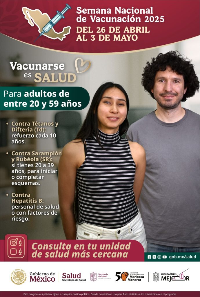 Morelia, Michoacán, 1 de mayo de 2025.- La Secretaría de Salud de Michoacán (SSM) recuerda que hasta el 3 de mayo, el sector salud, que incluye IMSS e ISSSTE aplicará más de 80 mil dosis en el marco de la Semana Nacional de Vacunación 2025, donde también la población adulta de 20 a 59 años será beneficiada.