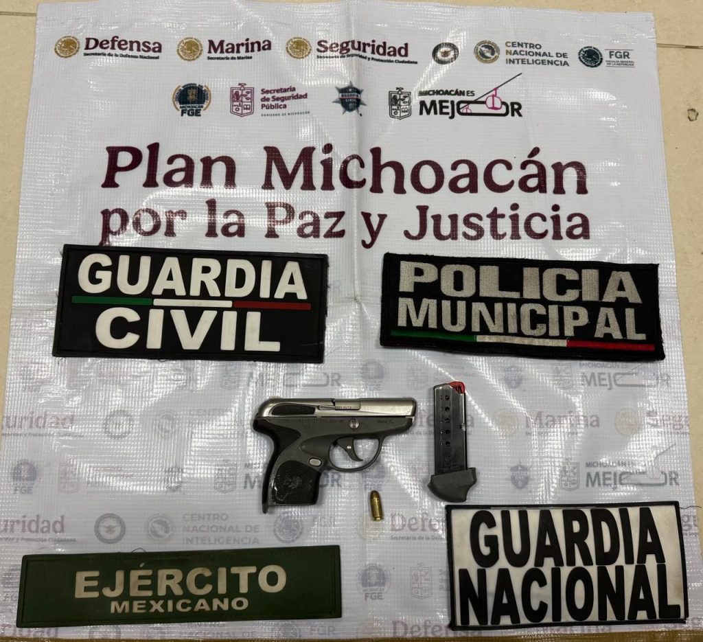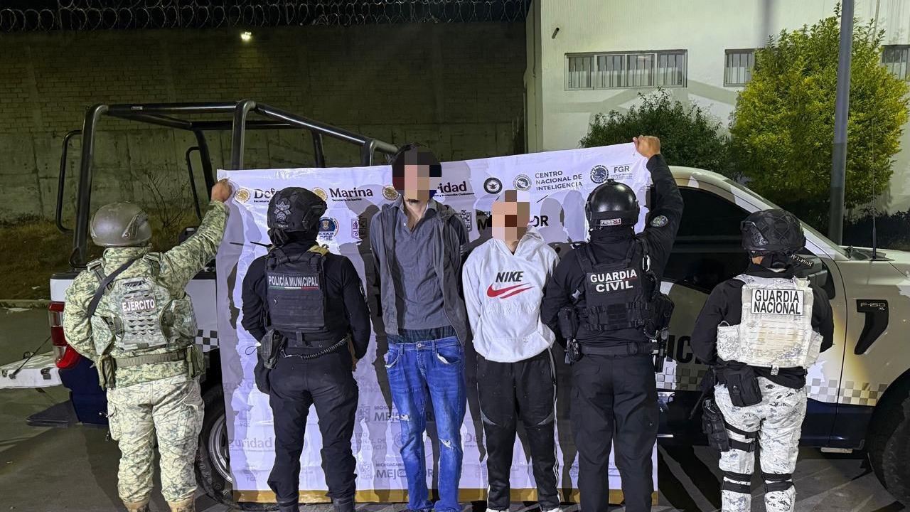 En otro hecho, sobre un tramo carretero del municipio de Jacona, efectivos de seguridad detuvieron a dos hombres tras una persecución. Los implicados tripulaban una camioneta marca GMC que contaba con reporte de robo con violencia; durante la intervención, se les incautó un arma de fuego corta.
