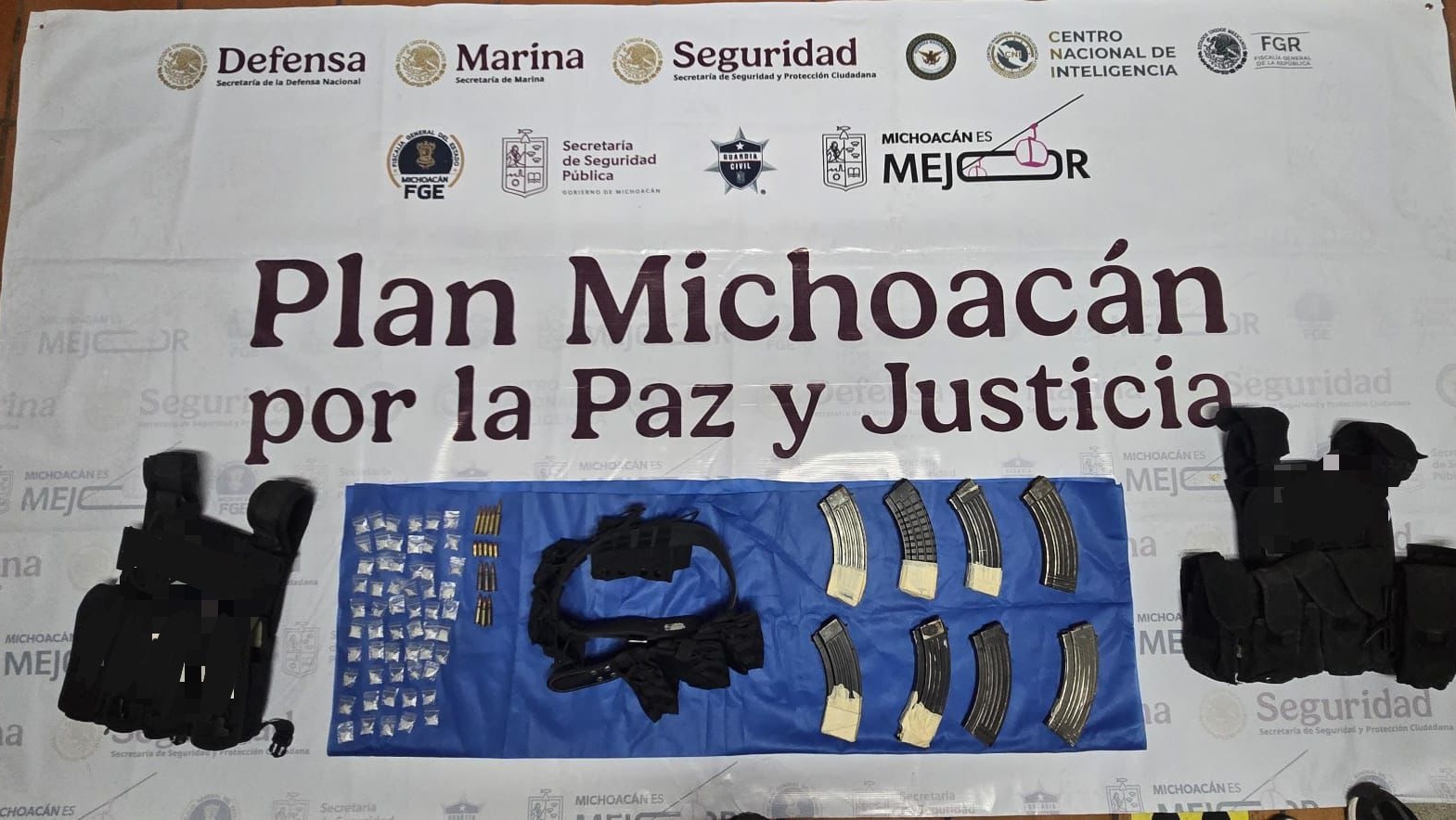 Durante la intervención, el personal operativo aseguró dos chalecos con portaplacas color negro con la leyenda de una célula delictiva, ocho cargadores, 11 cartuchos para arma larga, cinco cartuchos para arma corta, una fornitura y 57 dosis de una sustancia granulosa color blanco con características propias de la metanfetamina.