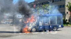 Queman manifestantes de Arantepacua camión repartidor frente a la FGE, en Morelia