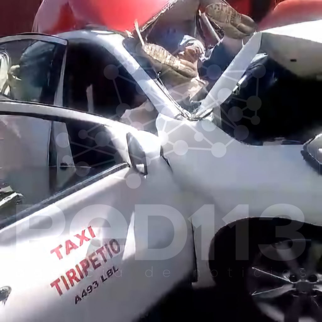 Se apreció que un tractocamión Kenworth, color rojo, embistió un taxi de la línea Tiripetío, placa A493LBL, el cual terminó destrozado y sus ocupantes lastimados y atrapados al interior.