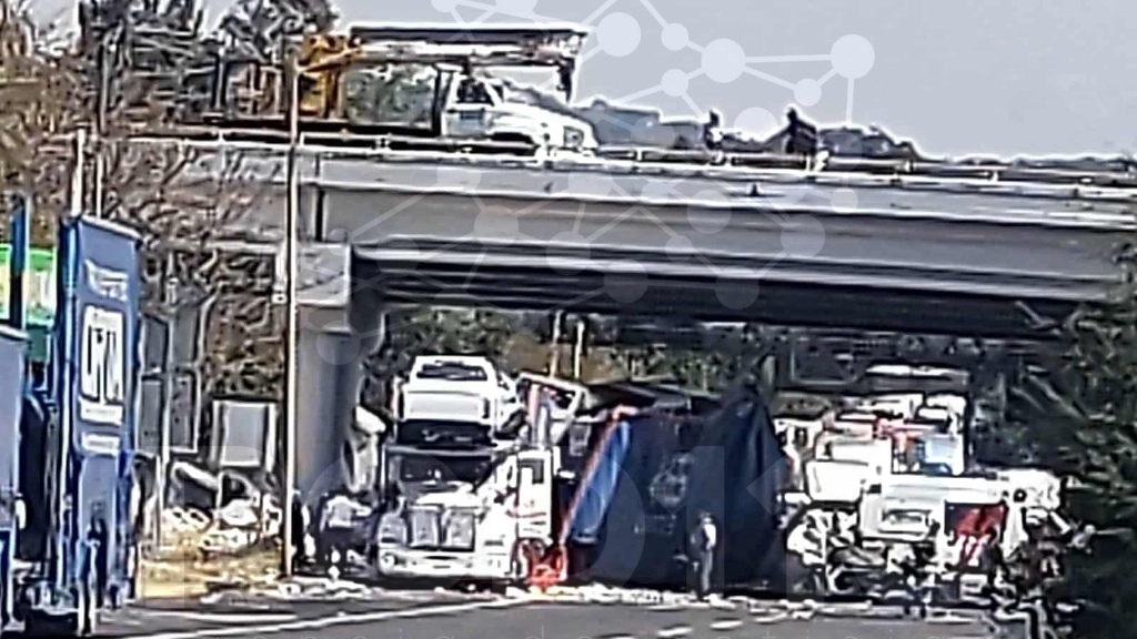 Zinapécuaro, Michoacán, 31 de enero de 2026.- Un tráiler con rótulos de la empresa «Autotransportes De Real», al cual presuntamente le fallaron los franos, se estrelló en la parte trasera de un tractocamión nodriza que transportaba varios vehículos sobre la autopista México-Guadalajara, dentro del municipio de Zinapécuaro.