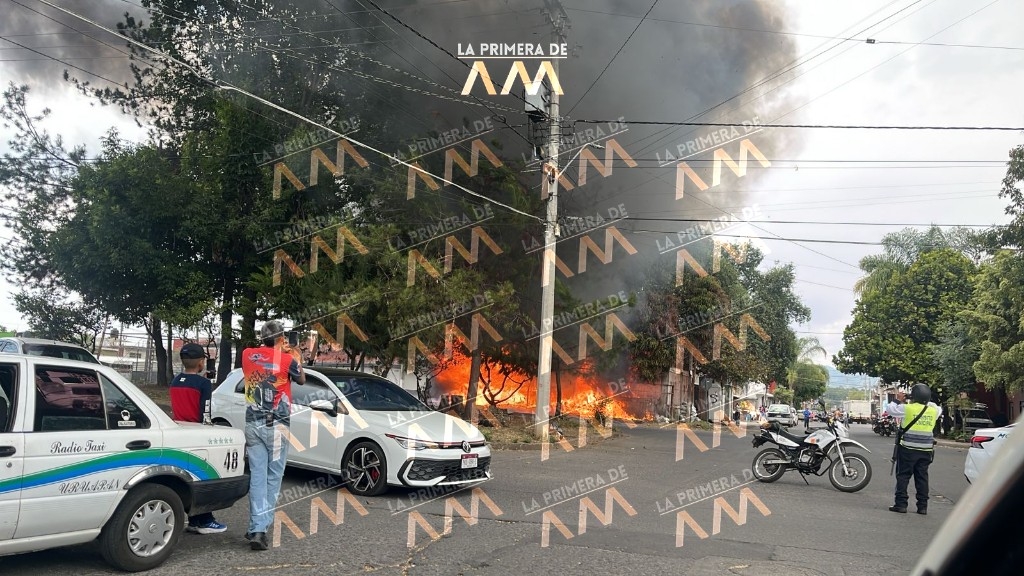 Uruapan, Michoacán, 30 de marzo de 2026.- Este mediodía, un incendio de gran magnitud consumió un taller de hojalatería y pintura ubicado en la colonia La Mora de esta ciudad de Uruapan, sin que se reportaran personas lesionadas.