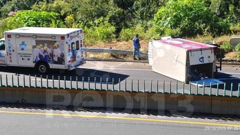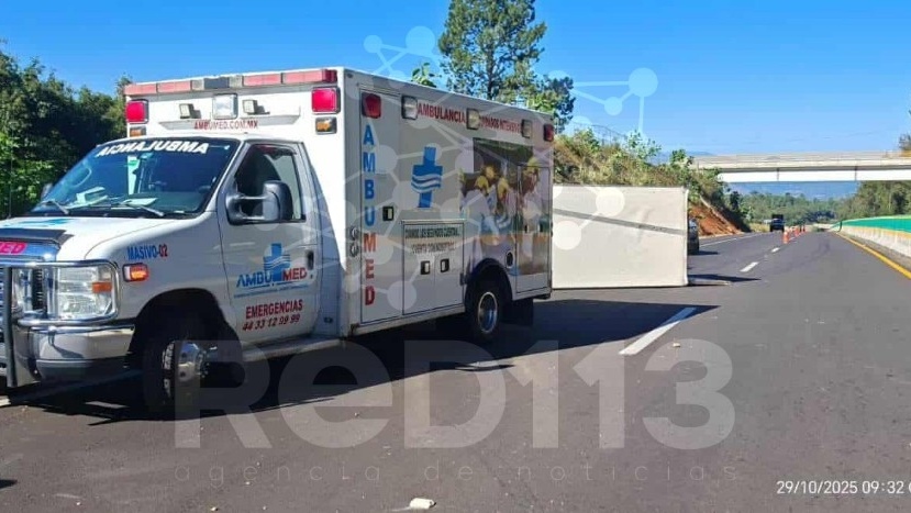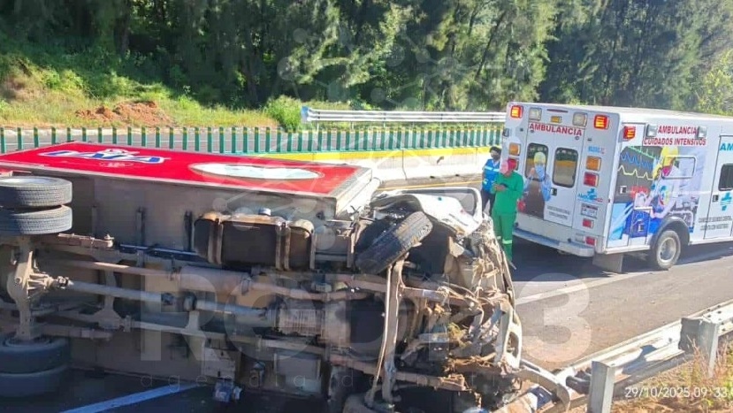 Salvador Escalante, Michoacán, 29 de octubre de 2025.- Un camión repartidor de la empresa LALA protagonizó la mañana de este miércoles una volcadura sobre la Autopista Siglo XXI, en el tramo Pátzcuaro-Uruapan, lo que generó la movilización de los cuerpos de auxilio y de seguridad.
