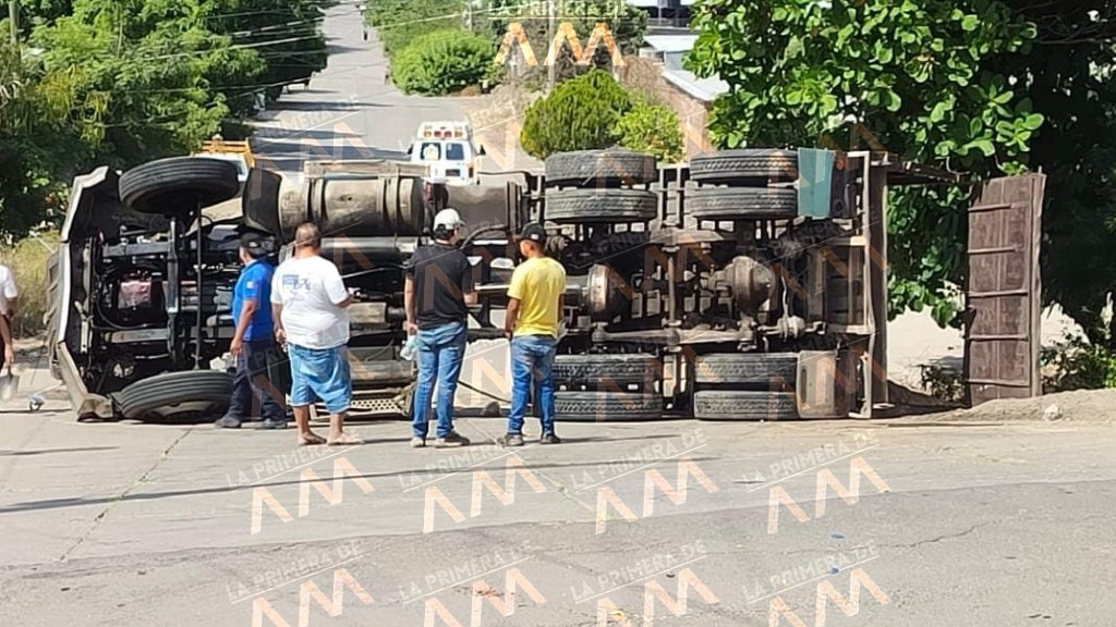 Apatzingán, Michoacán, 12 de Noviembre del 2025 – Un camión tipo volteo de color rojo, volcó alrededor de las 10:40 horas en la Av. Constituyentes esquina con la calle Félix Palavicini, de la colonia Lomas de Palmira.