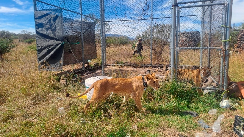 Los ejemplares, un tigre de Bengala y una leona africana, fueron hallados en condiciones de abandono extremo. El tigre permanecía confinado en una jaula sin techo, mientras que la leona se encontraba amarrada del cuello a la misma estructura.